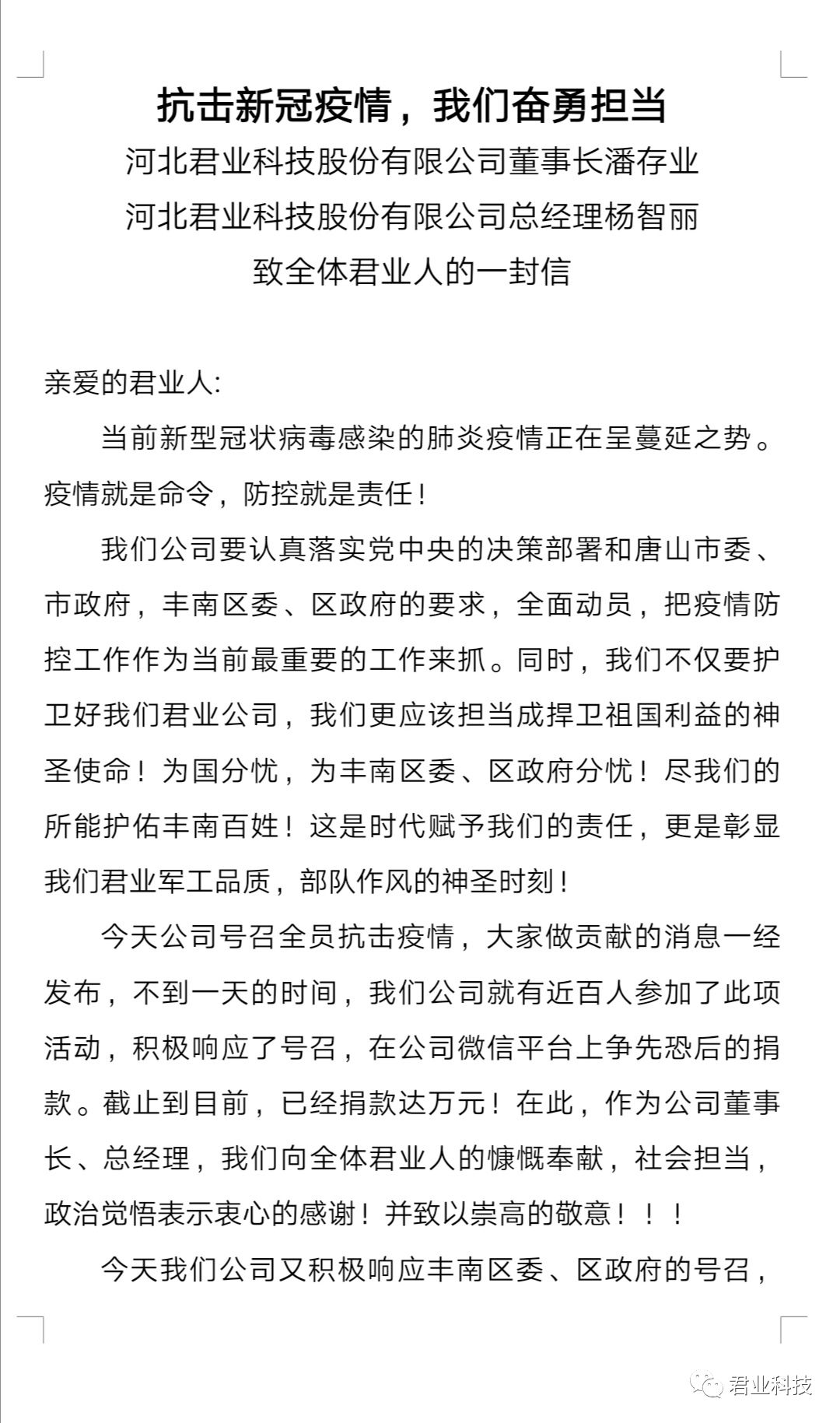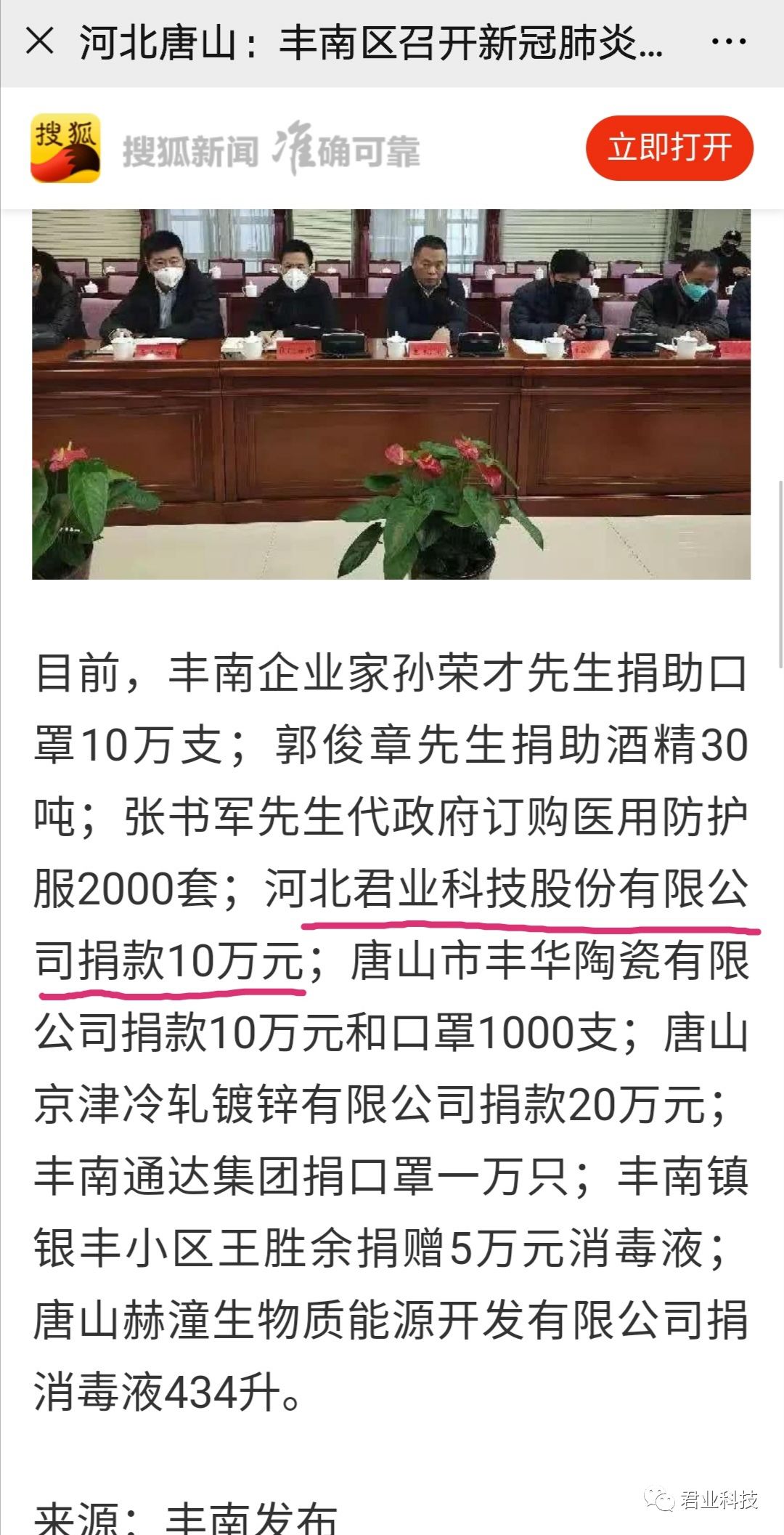 抗击疫情,河北君业科技股份有限公司在行动!众志成城,全员发动,公司号召员工表达爱心,员工积极响应,一天之内捐款近万元!集团领导,率先垂范,大爱无边,捐款给丰南区红十字会10万元。