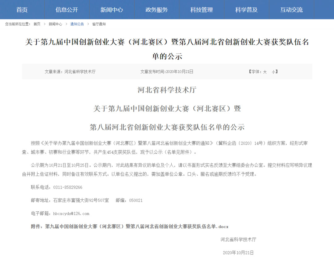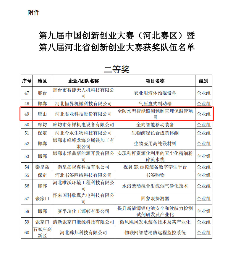 近期,河北省科学技术厅发布的《第九届中国创新创业大赛(河北赛区)暨第八届河北省创新创业大赛获奖队伍名单》中,河北君业科技股份有限公司的全防水性智能监测预制直埋保温管项目荣获“河北省创新创业大赛二等奖”奖项。