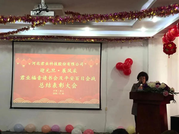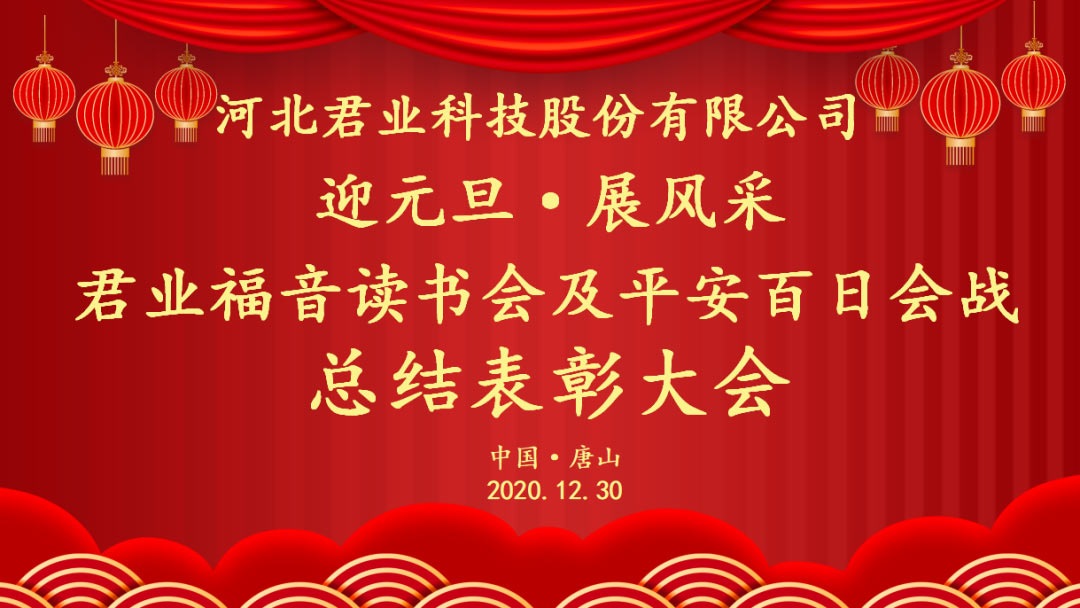 2020年12月30日上午9:00,河北君业科技股份有限公司全体员工在公司三楼会议室举行河北君业科技股份有限公司关于迎元旦·展风采君业福音读书会及平安百日会战总结表彰大会。大会主要目的是迎接元旦的到来,总结君业福音读书会及平安百日会战的活动情况,表彰活动中的优秀人物,树立典型,激励先进,鼓舞士气,总结经验,发扬成绩,团结和动员全体干部员工以更加崭新的思想观念,更加饱满的精神状态,扎实工作,向2020年献礼,向2021年进军。
