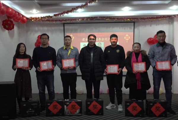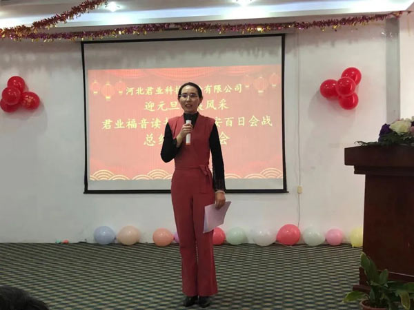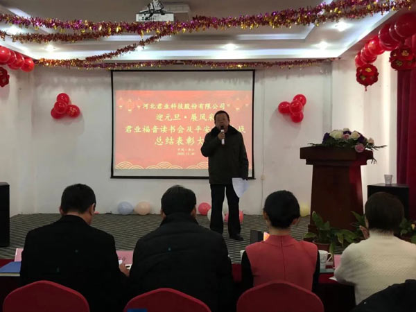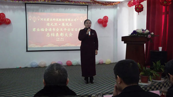 会上总经理杨智丽致新年贺词,销售部柳晓华总结了君业福音读书会开展情况,副总经理王金华总结了君业平安百日会战开展情况,播放了《君业福音读书会风采宣传片》及《君业平安百日会战宣传片》,技术部经理李德恒宣读了《关于表彰“君业福音读书会”先进团队、先进个人的决定》和《关于表彰“君业平安百日会战”先进团队、先进个人的决定》,公司领导对受到表彰的集体和个人给与奖励,两位家属代表进行讲话分享,董事长潘存业、总经理杨智丽为两位家属代表给与奖励,唐山劳动技师学院院长李文利进行读书指导,总经理杨智丽发表感言,大会最后,董事长潘存业做了重要讲话。
