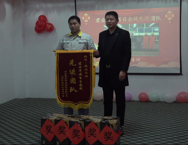 河北君业科技股份有限公司董事长潘存业为君业平安百日会战先进团队挤出车间颁奖