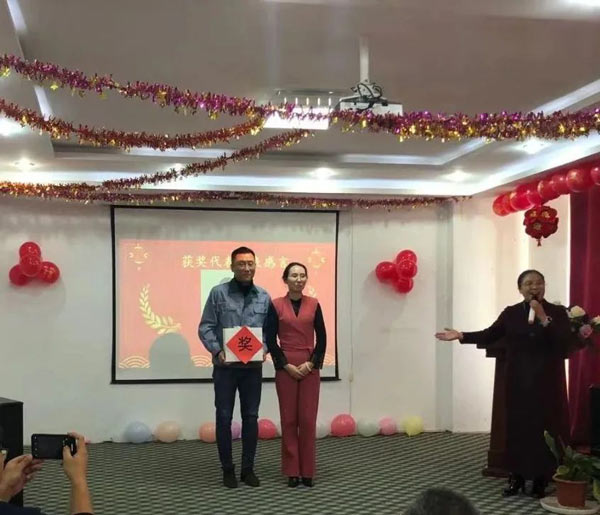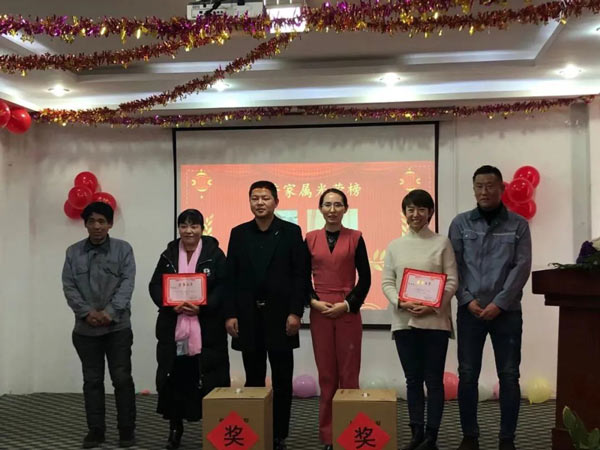 河北君业科技股份有限公司董事长潘存业、总经理杨智丽为员工家属代表颁发奖品