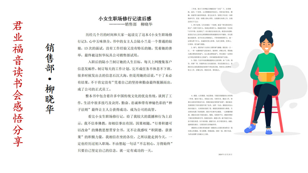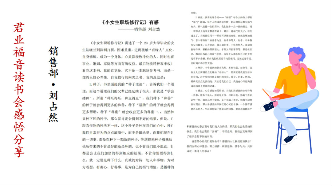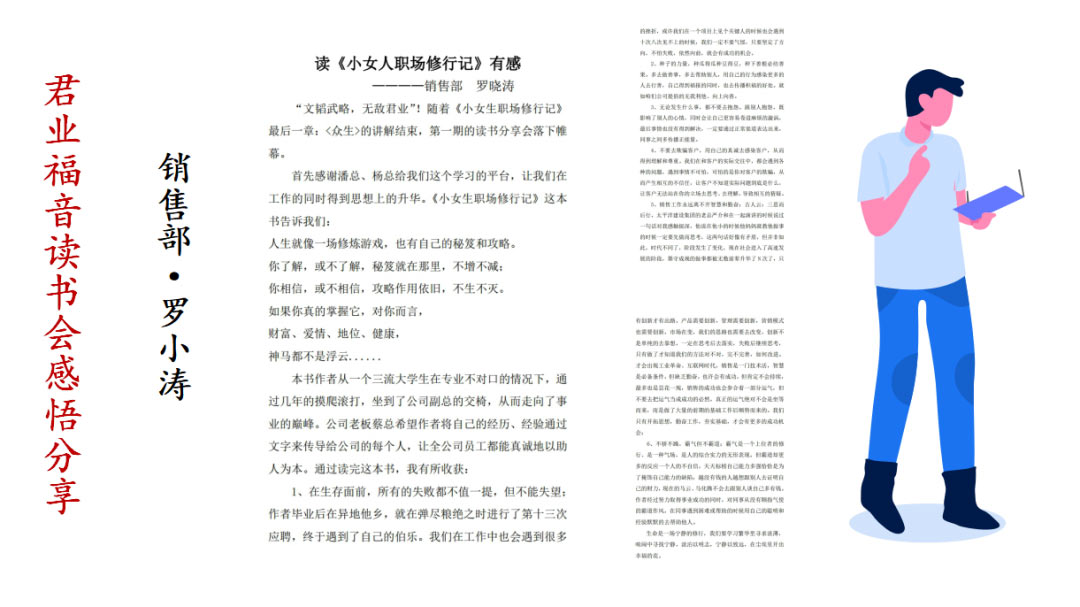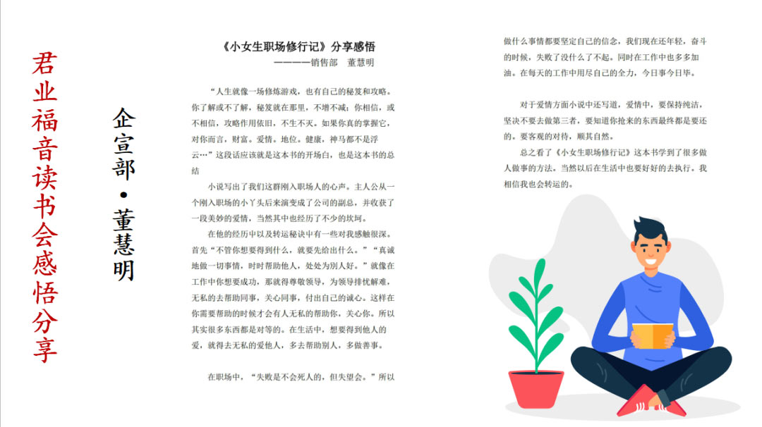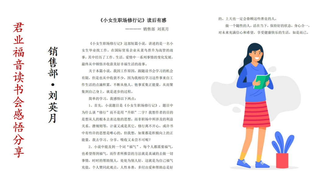 销售部柳晓华总结了君业福音读书会开展情况