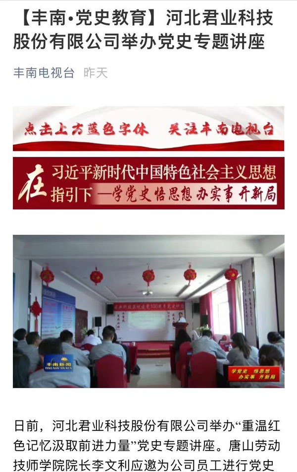 中国共产党的历史是一部丰富生动的教科书,为了纪念中国共产党建党100周年,重温党的历史,2021年6月4日下午,按照公司领导安排部署,特组织河北君业科技股份有限公司“重温红色记忆·汲取前进力量”聆听党史讲座活动,特别邀请唐山劳动技师学院院长李文利为公司全体干部员工进行专题授课,董事长潘存业高度重视,并亲自参加。同时,丰南电视台进行了相关报道。
