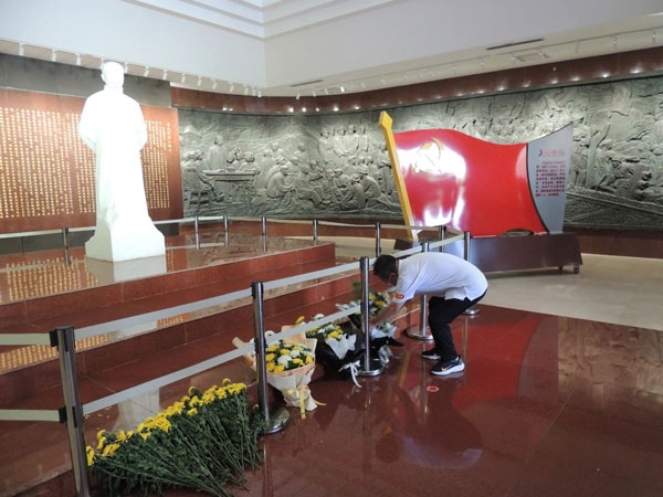 “革命先驱李大钊英魂永存”,全体党员首先向李大钊塑像敬献鲜花,河北君业科技股份有限公司党支部书记王金华上前敬献鲜花,并带领全体党员行鞠躬礼。