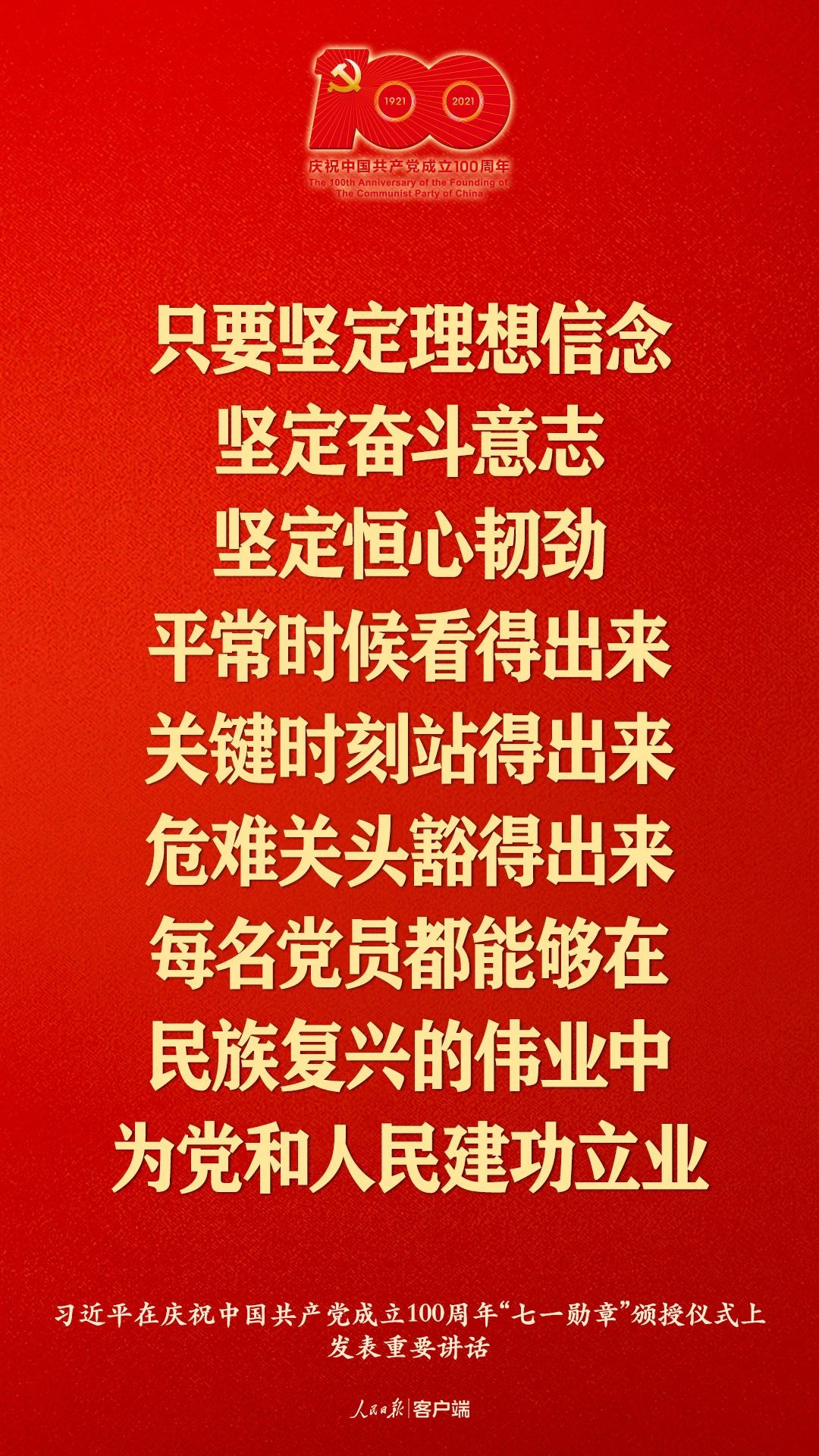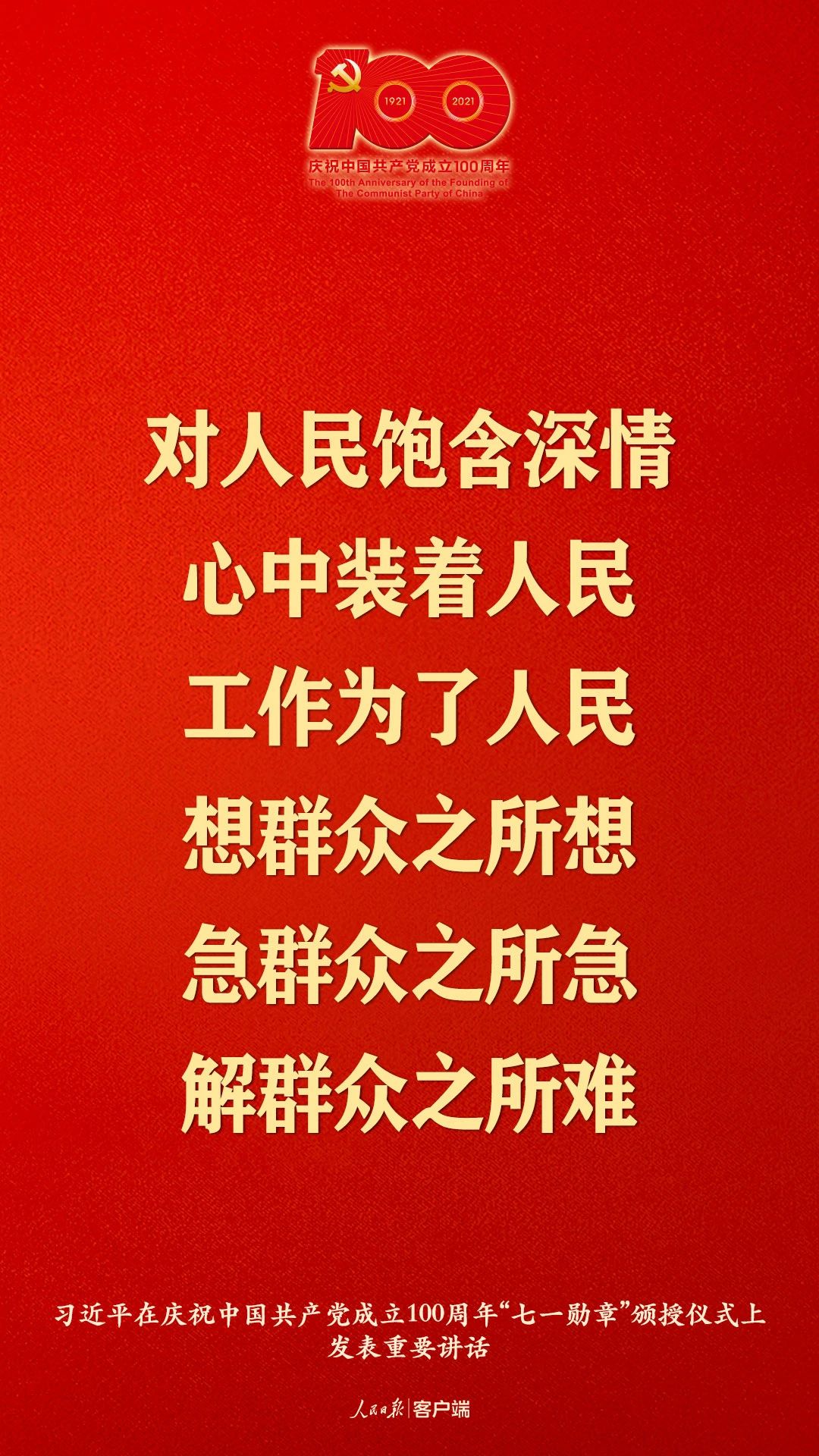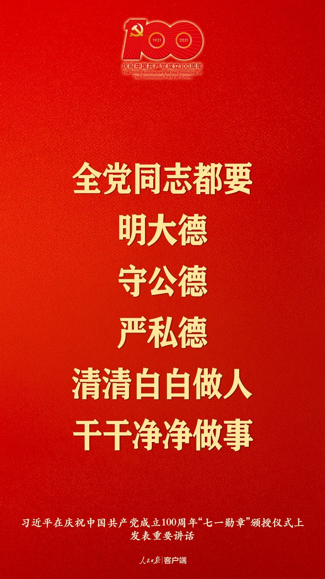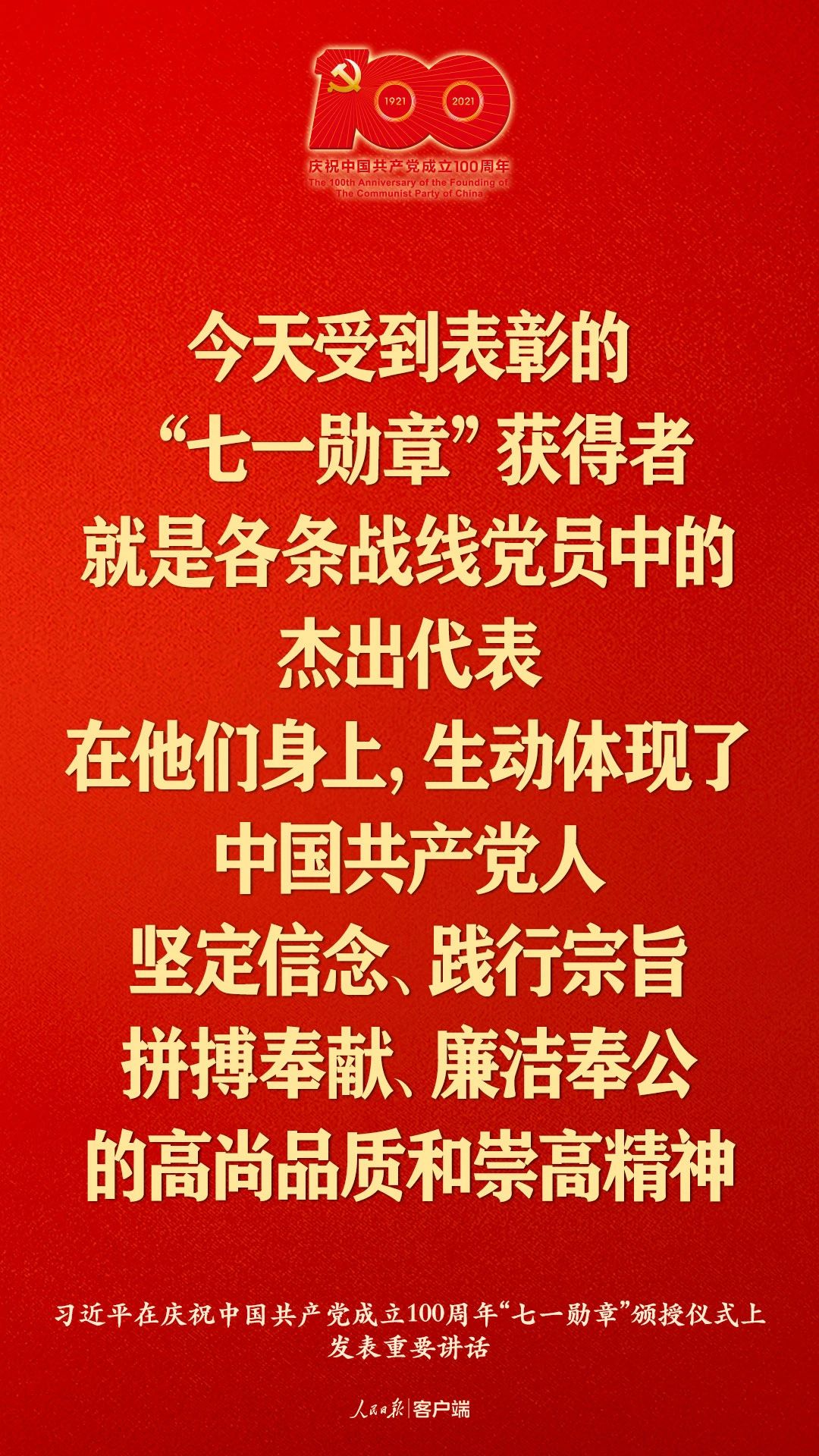 2021年6月29日上午,“七一勋章”颁授仪式在人民大会堂隆重举行。中共中央总书记、国家主席、中央军委主席习近平为“七一勋章”获得者颁授勋章并发表重要讲话。习近平指出,在他们身上,生动体现了中国共产党人坚定信念、践行宗旨、拼搏奉献、廉洁奉公的高尚品质和崇高精神。