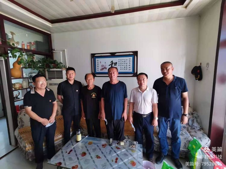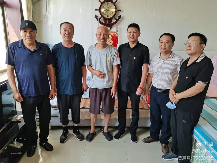 (从左至右)河北君业科技股份有限公司生产副总兼党支部书记王金华,河北君业科技股份有限公司董事长潘存业,退伍老兵吴香义,黑沿子镇政府主任科员毕经用、开发区管委会办公室副主任关立强、涧河三村党支书书记兼村委会主任毕新民