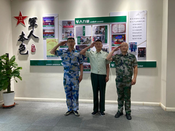 河北君业科技股份有限公司董事长潘存业(中)、公司退役军人代表王伟(左)、公司退役军人代表高尚(右)