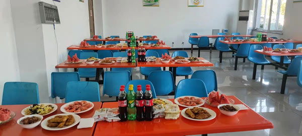 在公司食堂,每桌都准备了六个菜、月饼和饮料,员工们脸上都洋溢着幸福的笑容,体会到了家一般的温暖与关怀。