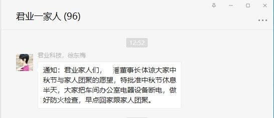 2021年9月21日(农历八月十五)中午,为庆祝中秋佳节,让公司员工在这个团圆的日子里感受到温馨和美好,河北君业科技股份有限公司综合办公室按照董事长潘存业、总经理杨智丽的指示为君业的家人们精心准备午餐,大家欢聚一堂,共庆中秋佳节。