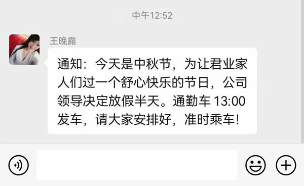 用完餐后,董事长潘存业为员工们准备了过节奖金,同时董事长潘存业体谅大家中秋节与家人团聚的愿望,特批准中秋节休息半天,回家跟家人团聚。