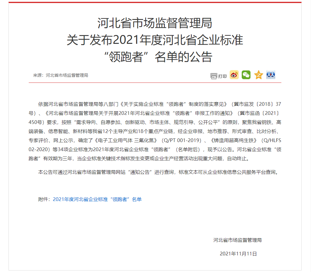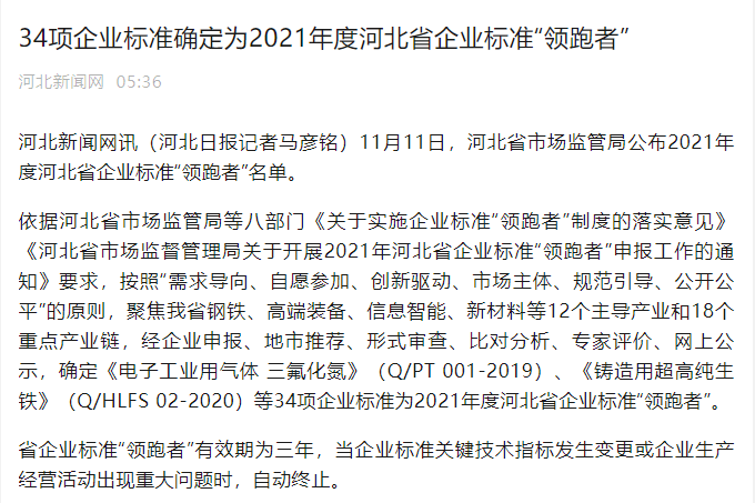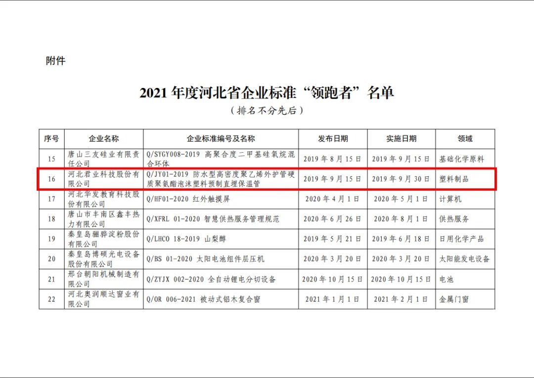近日,河北省市场监管局公布2021年度河北省企业标准“领跑者”名单中,河北君业科技股份有限公司凭借《防水型高密度聚乙烯外护管硬质聚氨酯泡沫塑料预制直埋保温管》企业标准,以在保温管道行业强大的自主创新能力和市场占有率,在众多企业中脱颖而出,成为塑料制品类“领跑者”中的一员。