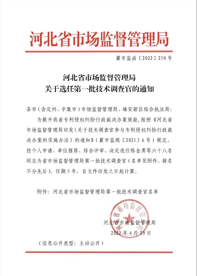编者按:近日,河北省市场监督管理局发布的《关于选任第一批技术调查官的通知》中,河北君业科技股份有限公司董事长助理、技术总监李德恒荣耀被选任为河北省市场监督管理局第一批技术调查官。
