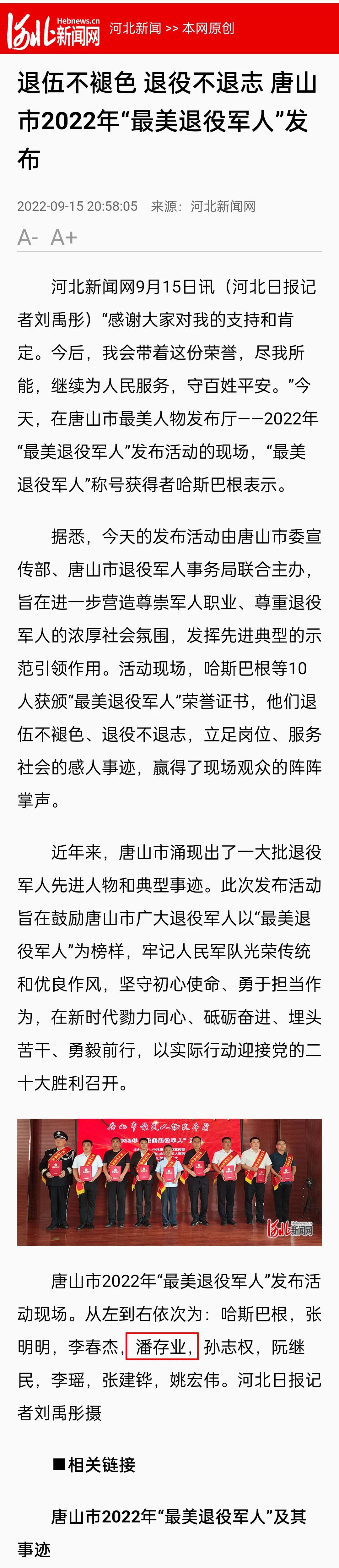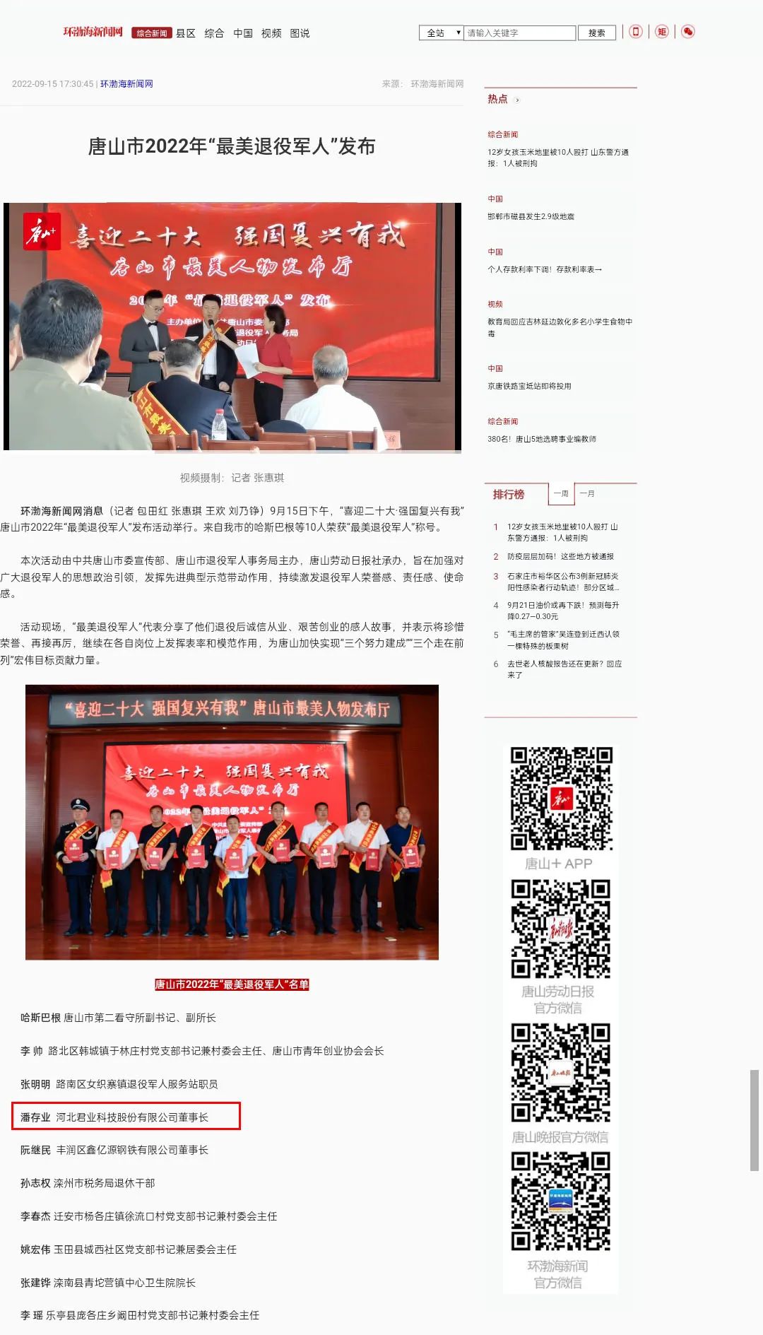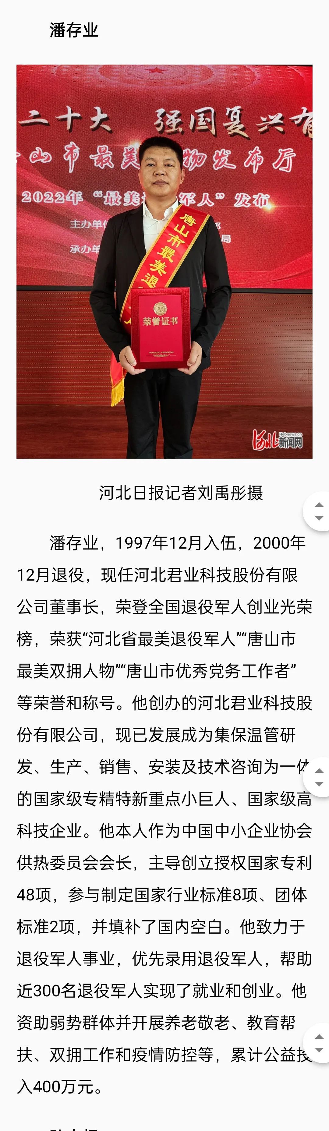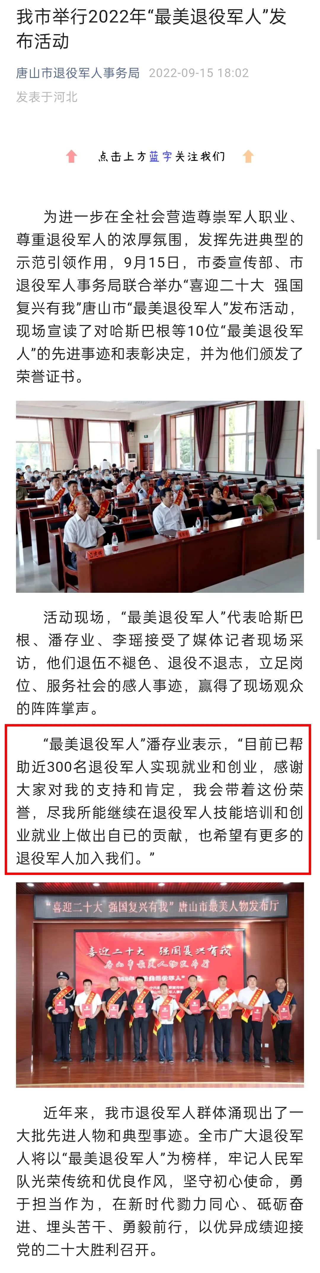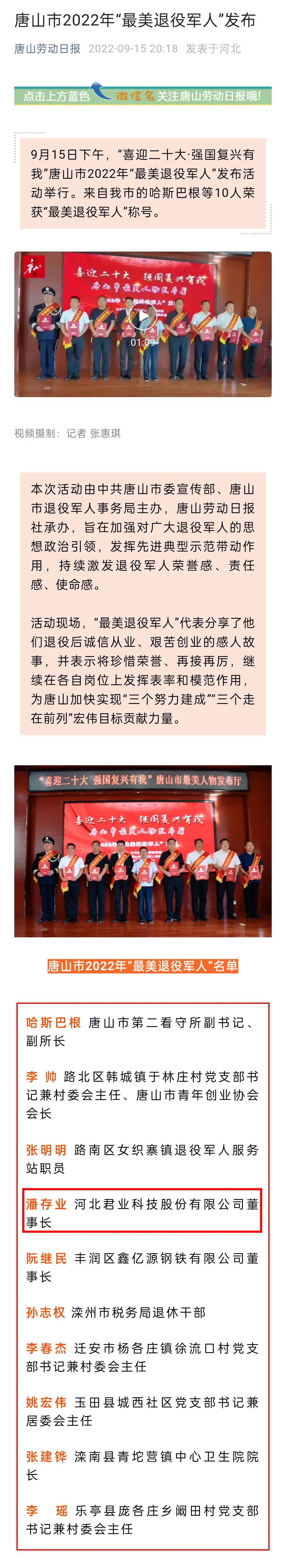 编者按:2022年9月15日,唐山市委宣传部、唐山市退役军人事务局对2022年度"唐山市最美退役军人"进行了发布。此次全市共评选出10名最美退役军人,河北君业科技股份有限公司董事长潘存业荣耀其中。腾讯新闻、环渤海新闻网、河北新闻网、冀云客户端、河北网络广播电视台、河北日报、唐山劳动日报等全省多家媒体记者云集现场,并纷纷报道。请看来自媒体的报道。