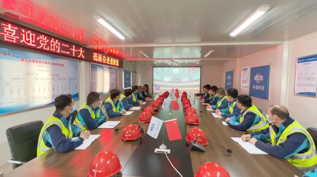 在中国二十二冶集团承建唐山市委党校迁建项目施工现场,20余名参建人员齐聚会议室,满怀着热切期待,通过网络直播方式,聚精会神地观看了党的二十大开幕会实况。