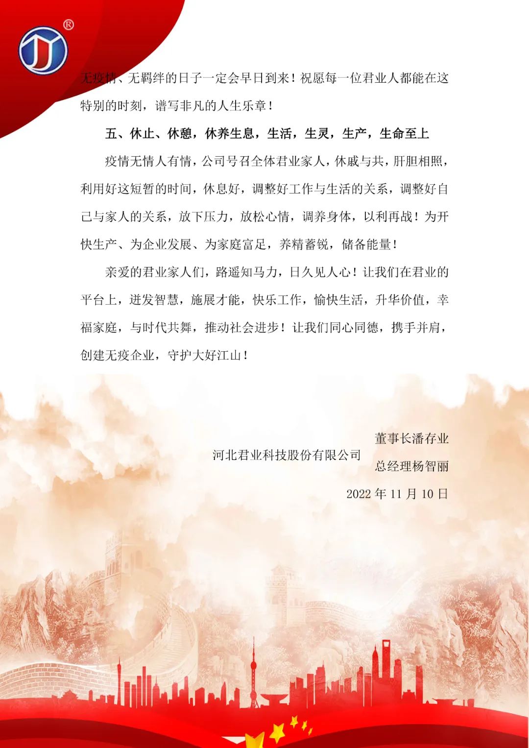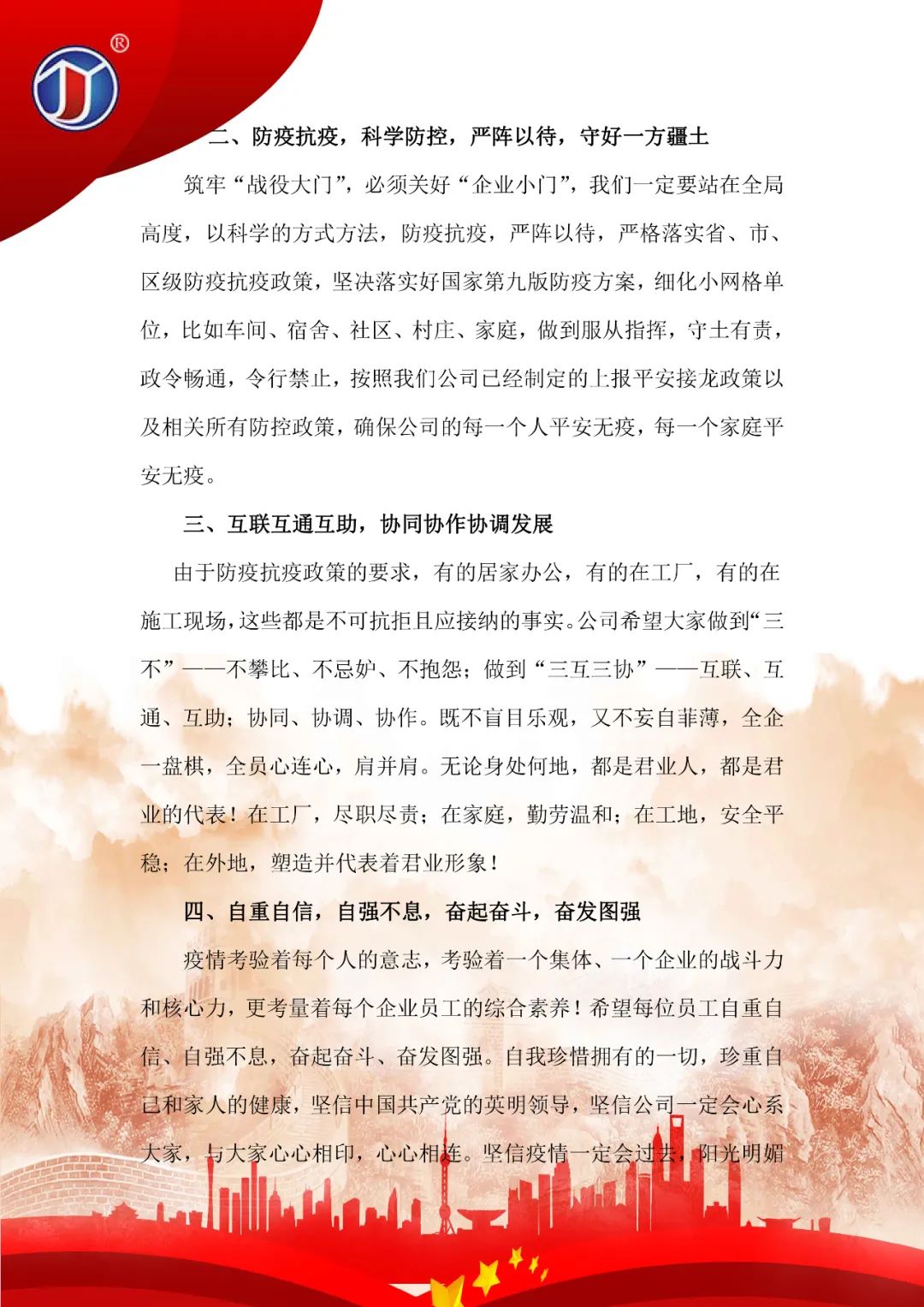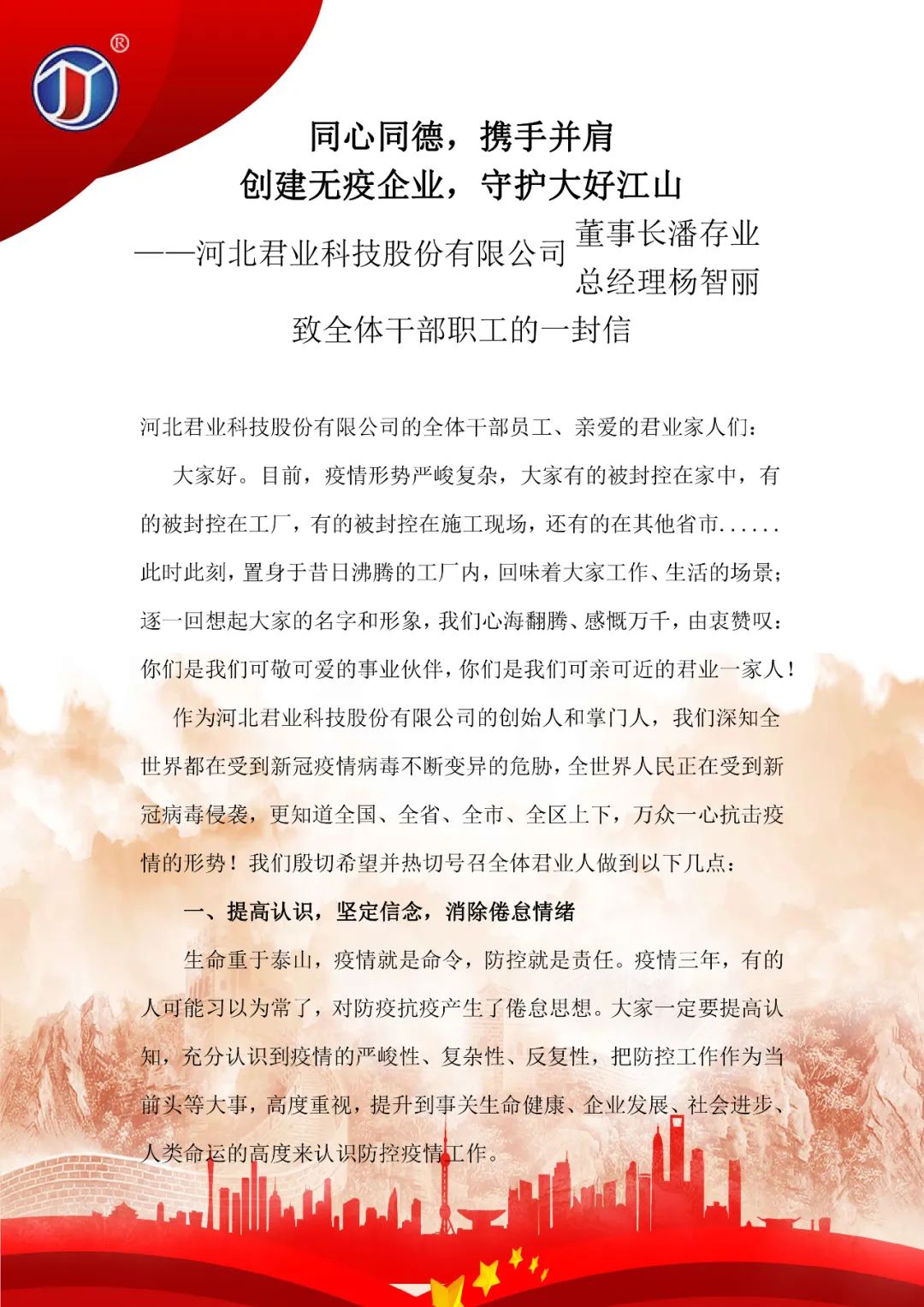 编者按:新冠疫情形势严峻,企业面临重大考验,人民的生产、生活、生命都受到了极大的挑战!做为企业家,他们不仅要掌舵企业的发展方向,增加企业的效益,培育大国品牌,锻造大国工匠,为社会增加发展动能,保障员工权益和收入,更要在关键时刻非常时期关心护佑好公司的每一位员工,每一个家庭。河北君业科技股份有限公司董事长潘存业、总经理杨智丽站位高远,心胸全局,肩负发展企业,回馈社会的神圣使命。今天,他们满怀深情给公司的干部员工写了一封信。详细内容如下一一