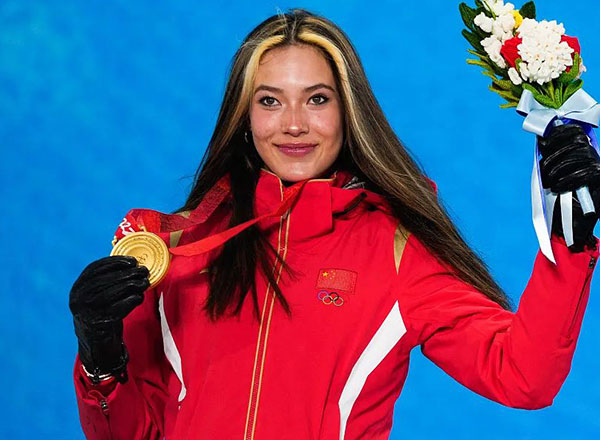 自由式滑雪女子U型场地 颁奖仪式举行 中国队选手谷爱凌 登上最高领奖台 带着自信的微笑谷爱凌挥手并亲吻金牌 庆祝胜利 这届冬奥会 谷爱凌获得两金一银 完美收官 ..