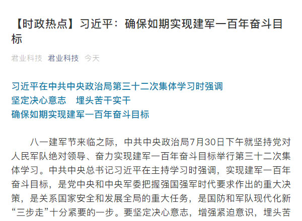 习近平在中共中央政治局第三十二次集体学习时强调 坚定决心意志 埋头苦干实干 确保如期实现建军一百年奋斗目标八一建军节来临之际,中共中央政治局7月30日下午就坚持党..