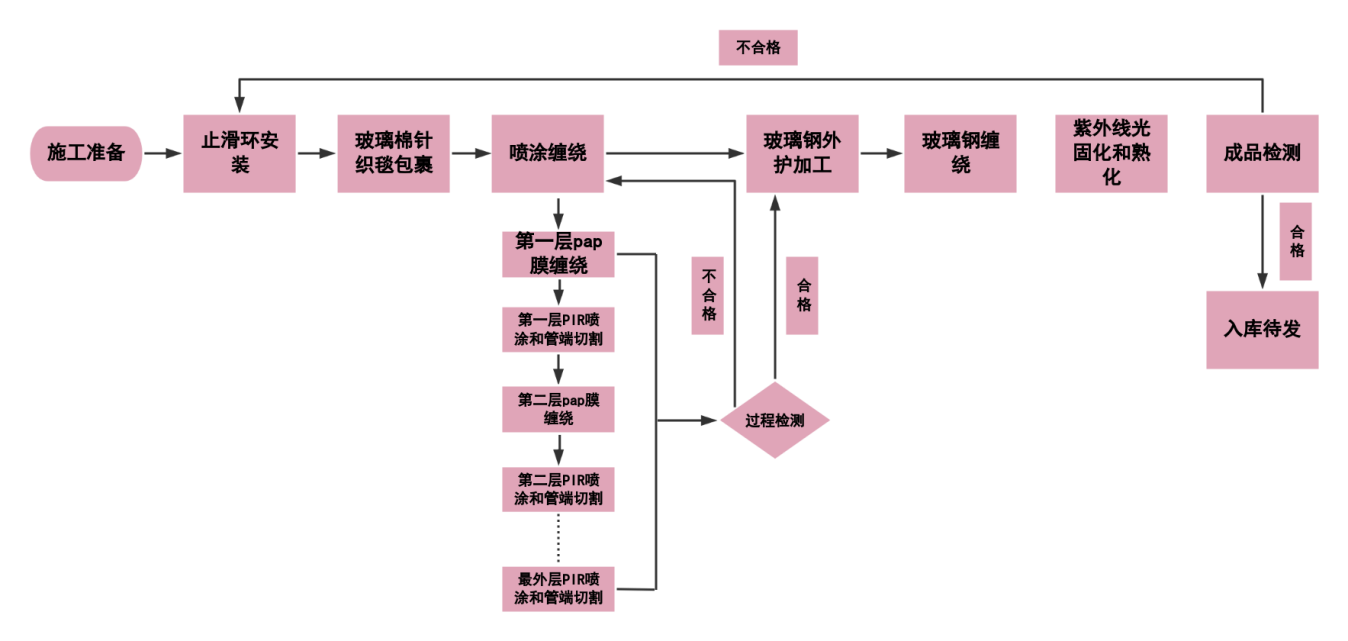 材料准备:根据设计要求,采购合格的管道、止滑环、玻璃棉针织毡、PAP铝膜、PIR泡沫原料、紫外线玻璃钢材料等,确保材料质量符合相关规范,进场材料需附带质量证明文件,并按规定进行抽样检验。